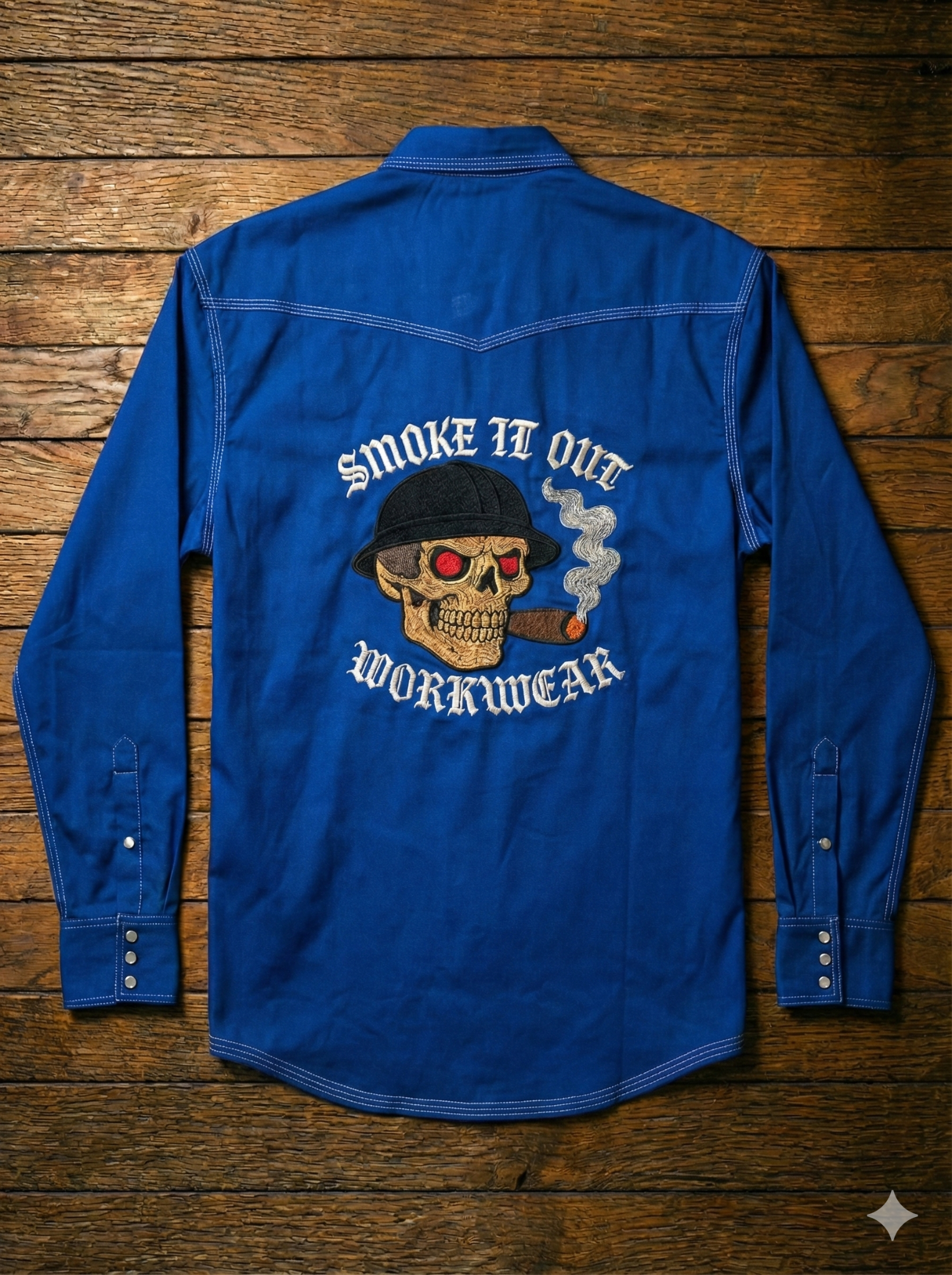 Every detail is intentional—from the triple-stitched seams for extreme durability, to the fully embroidered front and back artwork that won’t crack, fade, or peel under hard use. Finished with classic pearl snap closures, reinforced pockets, and rugged contrast stitching, this shirt blends old-school toughness with modern FR performance.